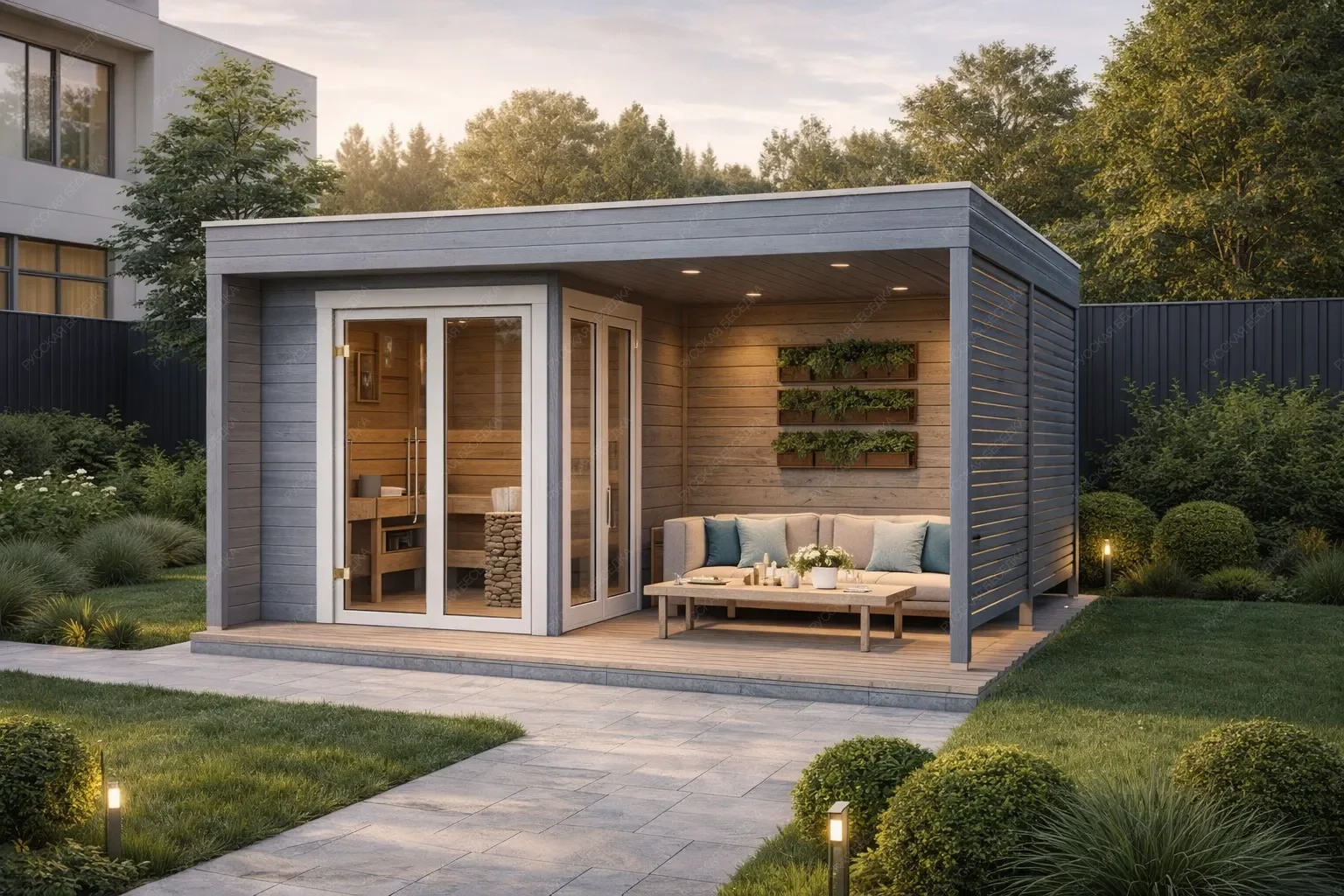 Каркасная баня «Дго» представляет собой концептуально минималистичное решение, сконцентрированное исключительно на процедуре парения и последующем отдыхе. При компактных габаритах 4,5х2,4 метра и площади 10,8 кв.м., строение с односкатной крышей состоит из парной и просторной крытой террасы, что определяет его формат как садовой сауны. Парная, лишенная внутренних перегородок, максимально раскрывается окружающему ландшафту через панорамные окна и такую же дверь, создавая ощущение нахождения на природе. Такое остекление, вместе с удобством для установки компактной электропечи, формирует современный и технологичный образ. Крытая терраса, защищенная свесом кровли, логически продолжает пространство, предоставляя готовую площадку для размещения мягкой мебели и стола, трансформируя объект в полноценную зону релаксации на свежем воздухе. Идеальный выбор для тех, кто ценит лаконичность, скорость монтажа каркасной конструкции и стремится к созданию личного спа-уголка без излишней сложности планировки.