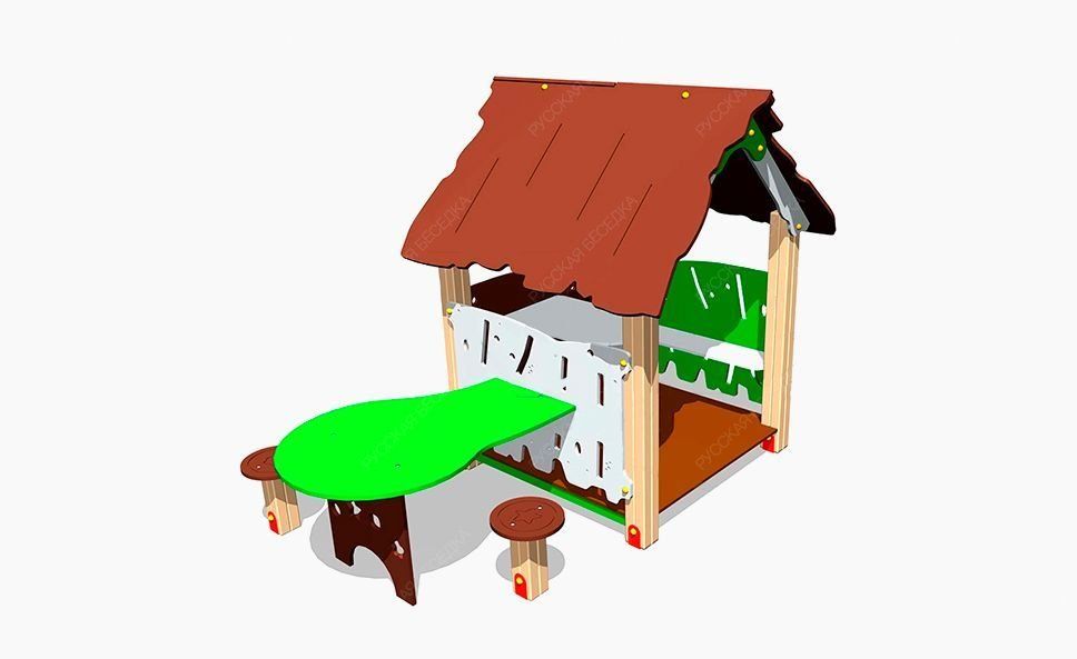 Детский игровой домик «Хижина со столиком», помимо стола и скамеек под крышей, имеет столешницу за ее пределами. Таким образом, дети могут играть как в помещении домика, так и на природе. Вдоль внешней столешницы устанавливаются две табуретки из влагостойкой фанеры. Это оборудование эксплуатируется на детских игровых площадках.