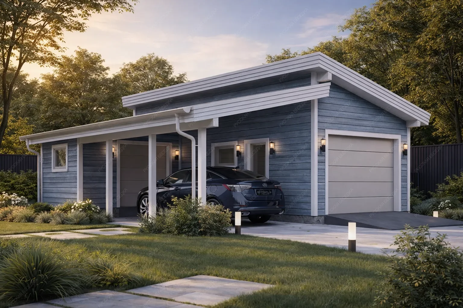 Гараж односкатный с навесом Бастион