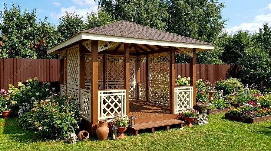 Современный ландшафтный дизайн и беседки - центральные элементы загородного участка. Беседка должна размещаться в таком месте участка, где вам будет комфортно находиться, а также она должна отвечать своему назначению и притягивать взгляды. Беседка является уникальным строением, с ее помощью можно отдохнуть за чашечкой кофе, укрыться от знойного солнца или провести шумный праздник в кругу семьи и друзей.