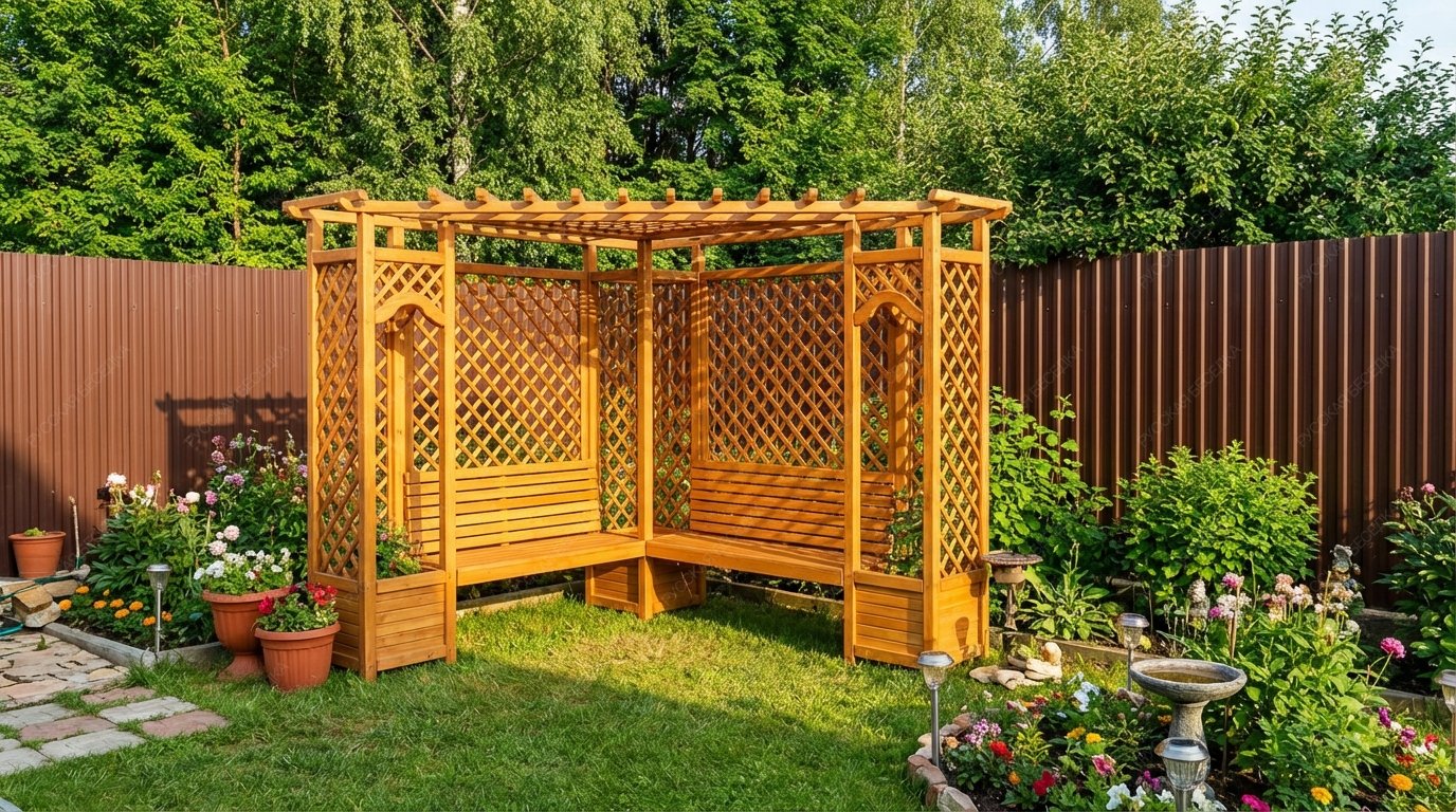 Пергола с навесом обеспечивает надежную защиту от солнечных лучей, создавая тенистое пространство для отдыха. Она станет идеальным местом для встреч с друзьями, чтения книг или приема пищи на свежем воздухе.