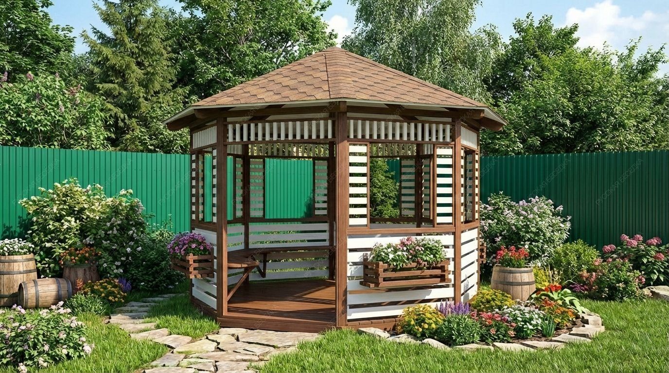Современный ландшафтный дизайн и беседки - центральные элементы загородного участка. Беседка должна размещаться в таком месте участка, где вам будет комфортно находиться, а также она должна отвечать своему назначению и притягивать взгляды. Беседка является уникальным строением, с ее помощью можно отдохнуть за чашечкой кофе, укрыться от знойного солнца или провести шумный праздник в кругу семьи и друзей.