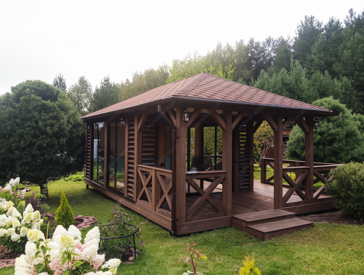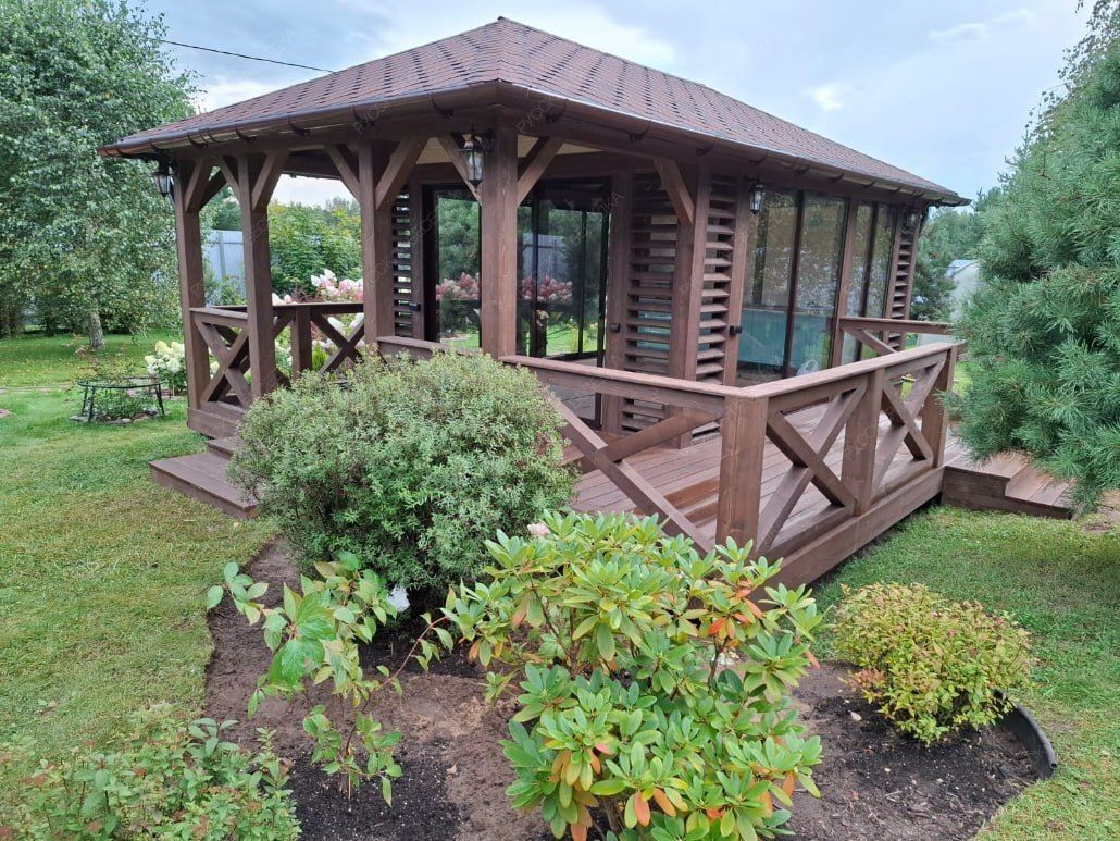 Беседка выполненная из лучших пород древесины, прослужит долгие годы и не потребует особого ухода и обслуживания. Специальные лакокрасочные материалы которые мы используем, предотвратят старение, гниение и заражение грибком конструкции кухни. Используемая огнебиозащита образует полупрозрачное полуматовое покрытие, стойкое к влаге, УФ-излучению, перепадам температуры и другим атмосферным воздействиям.